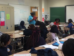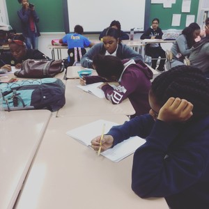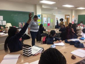 It’s Wednesday, March 1st at The Young Women’s Leadership School (TYWLS) in Jamaica, Queens, which means that it’s time for their weekly class with Katie & Community-Word Project. However, it’s a very special day for the young women in this class because the two Teaching Artist trainees that have been assisting in this class as a part of CWP’s Teaching Artist Training & Internship Program (TATIP), Rabih Ahmed and Jennifer Jones, are facilitating the lesson for the first time ever.