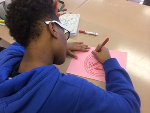 All around students are sharing poems they’ve written, swapping images and lines, boasting about their work. Except one student. Amber sits quietly in the corner, drawing angry spirals over and over again in her journal. Teaching Artist Katie Rainey spots her and asks her about her poem.