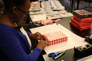 On the week prior, many AB Volunteers came together to order various book titles including Mercy Watson, Sideways Stories from Wayside School and Poppleton, and hold an in-office wrapping party in advance of the book party with the students.