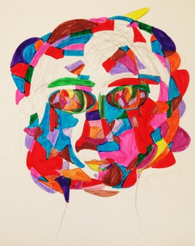 Students utilized the surrealist technique of automatism to create a blind contour drawing of their peers. In a blind contour drawing, the artist is charged with creating the image without ever looking at the page. Once this was complete, the students added color. They then selected text from their name narrative or collaborative poem, which were created earlier in the residency, to create a mixed media visual poem on paper.
