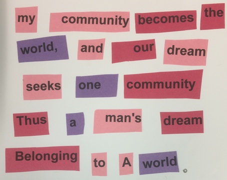 Table groups were given a baggie filled with the poem puzzle, a piece of poster and asked to work together to put the puzzle together as they collectively decided. The purpose of this lesson was not to perfectly recreate the poem but to start to consider the power of word order and expose the students to collective creation.