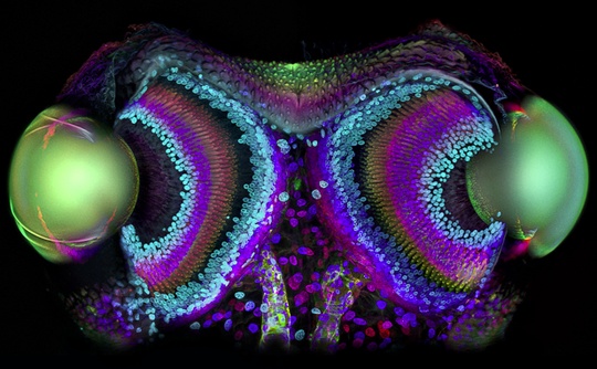 Image: A frontal section of Phalangium opilio (Daddy Longlegs/Harvestman) eyes. The lenses (two large ovals), retinas and optic nerves are visible. The image is a depth color-coded projection of a confocal image stack. First Prize, 2010 Olympus BioScapes Digital Imaging Competition®.